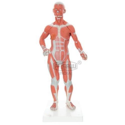 Shows superficial and deep muscles, blood vessels and nerves, and internal organs, which can be partially dissected. Male and female genital organs are interchangeable.