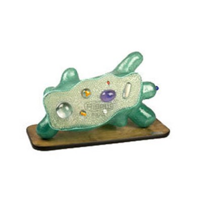 - The nucleus, food vacuoles containing diatoms and bacteria, contractile vacuole, fat droplet, and granular and clear zones of cytoplasm are represented, while the position of the pseudopods indicates the amoeba's movement.