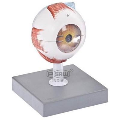 Removable sclera upper half with cornea and eye muscleattachments, both choroids halves with iris and retina, lens,and vitreous humor for detailed examination