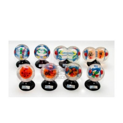 - Organelles and cell inclusions are embedded in strong, crystal-clear plastic globes consisting of the nucleus, nucleolus, double thread chromosomes (each in a different color), centrioles, centromeres (kinetochores), aster, and spindle fibers.