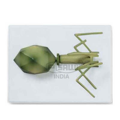 This model, enlarged millions of times, shows the structure of bacteriophage T4, a virus that attaches to the surface of the much larger bacterium Escherichia coli.