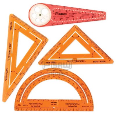 Includes all the basic tools for geometry: a Compass, a Protractor and 2 Triangles (45deg and 60deg ).