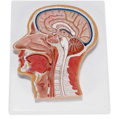 Mounted on a base, appropriately colored and numbered with keycard. The model of human head and neck showing the all internal organs like median section of brain, nose, mouth and pharynx, larynx and vertebral column of the neck.