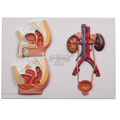 This 3-part plaque mount features detailed sagittal sections of male and female pelvises, highlighting major urogenital structures of each.