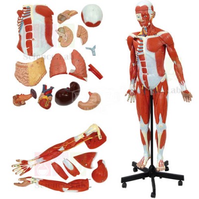 This 32-part model includes a removable 6-part muscular arm and an 8-part muscular leg. The skullcap is removable to reveal a bisected brain; the brain is cut along the longitudinal fissure and shows internal structures as well as vasculature. The 2-part heart is removable and represents the atria, ventricles, valves, and sections of the heart wall. The liver with gallbladder, 2-part stomach, duodenum with pancreas and spleen, and large intestine are also removable. The lungs are bisected and removable to show the bronchial tree and vascular system. Anatomical structures are numbered and referenced on the accompanying key card. Rod-mounted on base with casters. Model size, 140 cm tall; total size, 150 x 50 x 40 cm. Wt, approximately 12 kg.