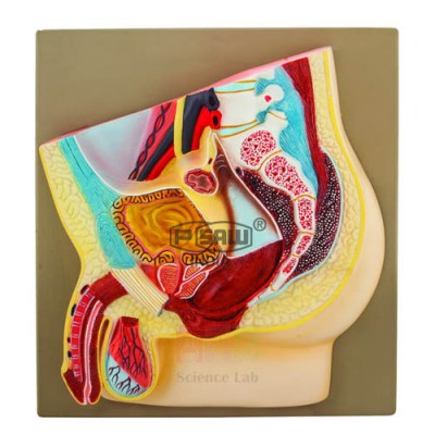 Shows the rectum, bladder with prostrate and testicular ducts and external genital organs.