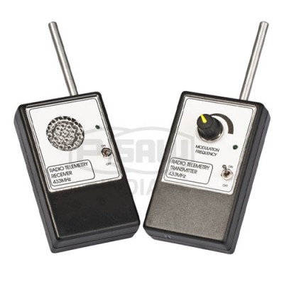 The transmitter sends out a variable audio tone and the receiver has a built-in loudspeaker.