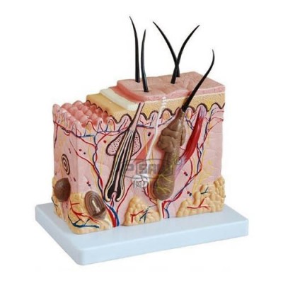 Desk model scalp and hairless skin with radix pili, sweatglands, Meissners corpuscle.